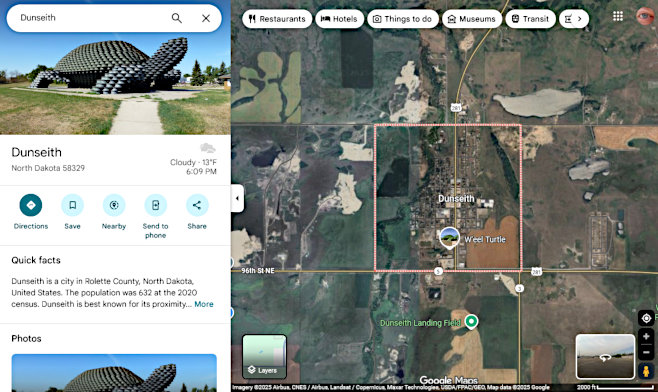 https://www.google.com/maps/place/Dunseith,+ND+58329/@48.8130362,-100.082807,4406m/data=!3m2!1e3!4b1!4m6!3m5!1s0x52dc4dbfd5fef5f7:0x6614e84fea697508!8m2!3d48.8130569!4d-100.0609678!16zL20vMHlyNnI