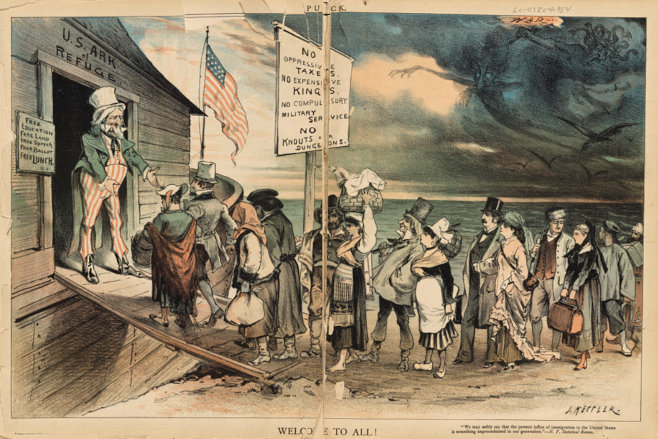 https://www.loc.gov/resource/ds.16265/ January 25, 2026 "Welcome to All", lithograph by J. Keppler, illustration in Puck (April 28, 1880)